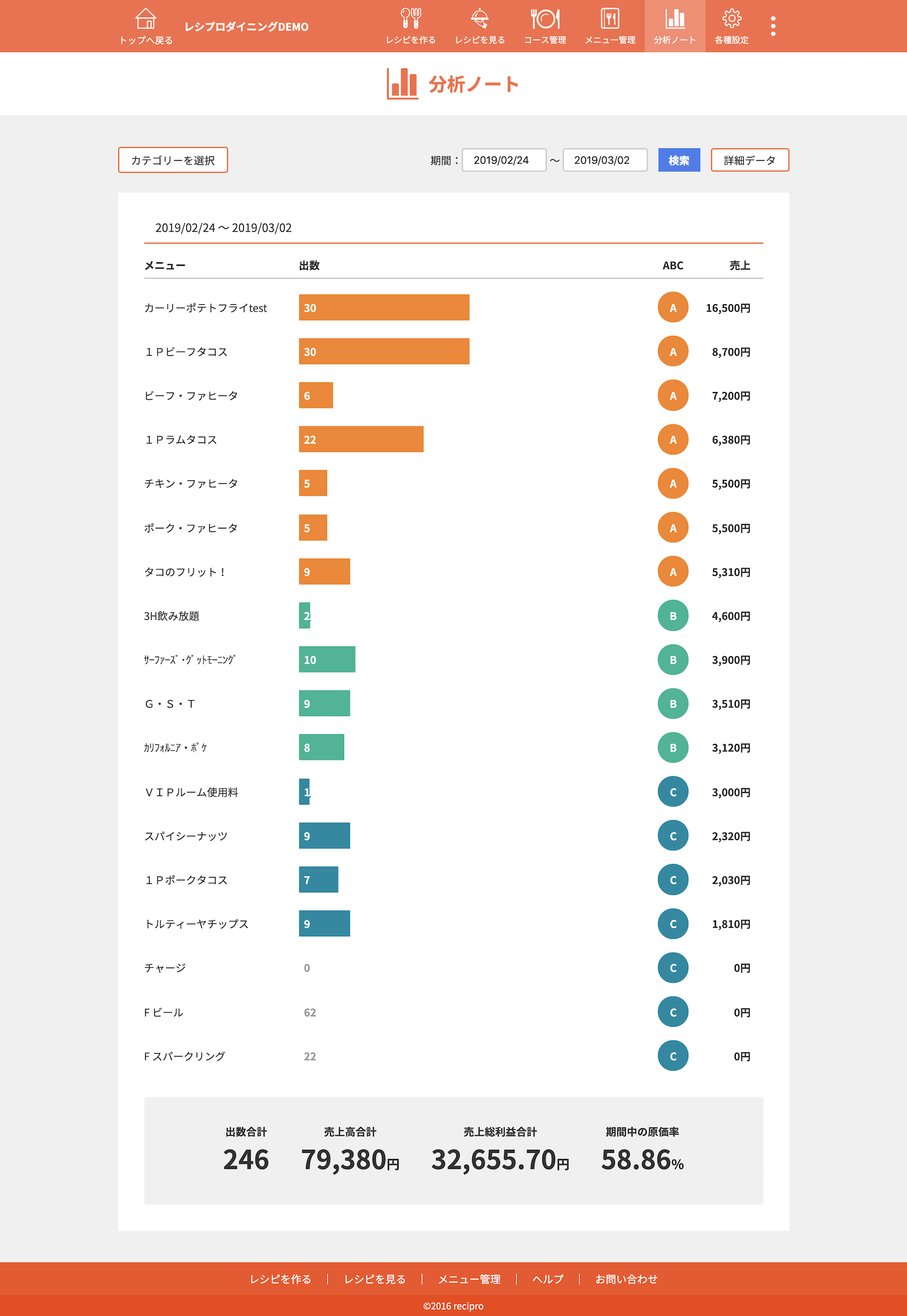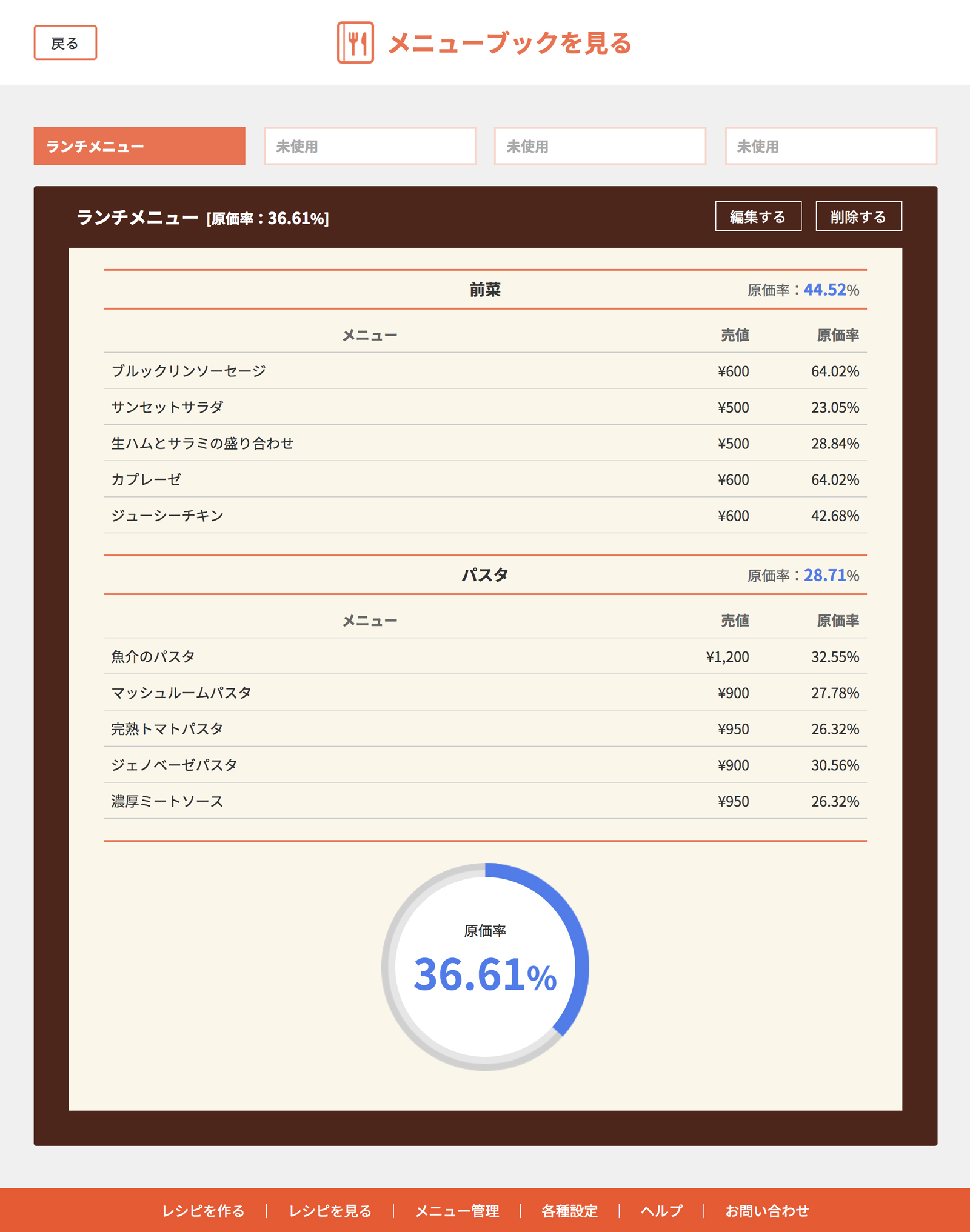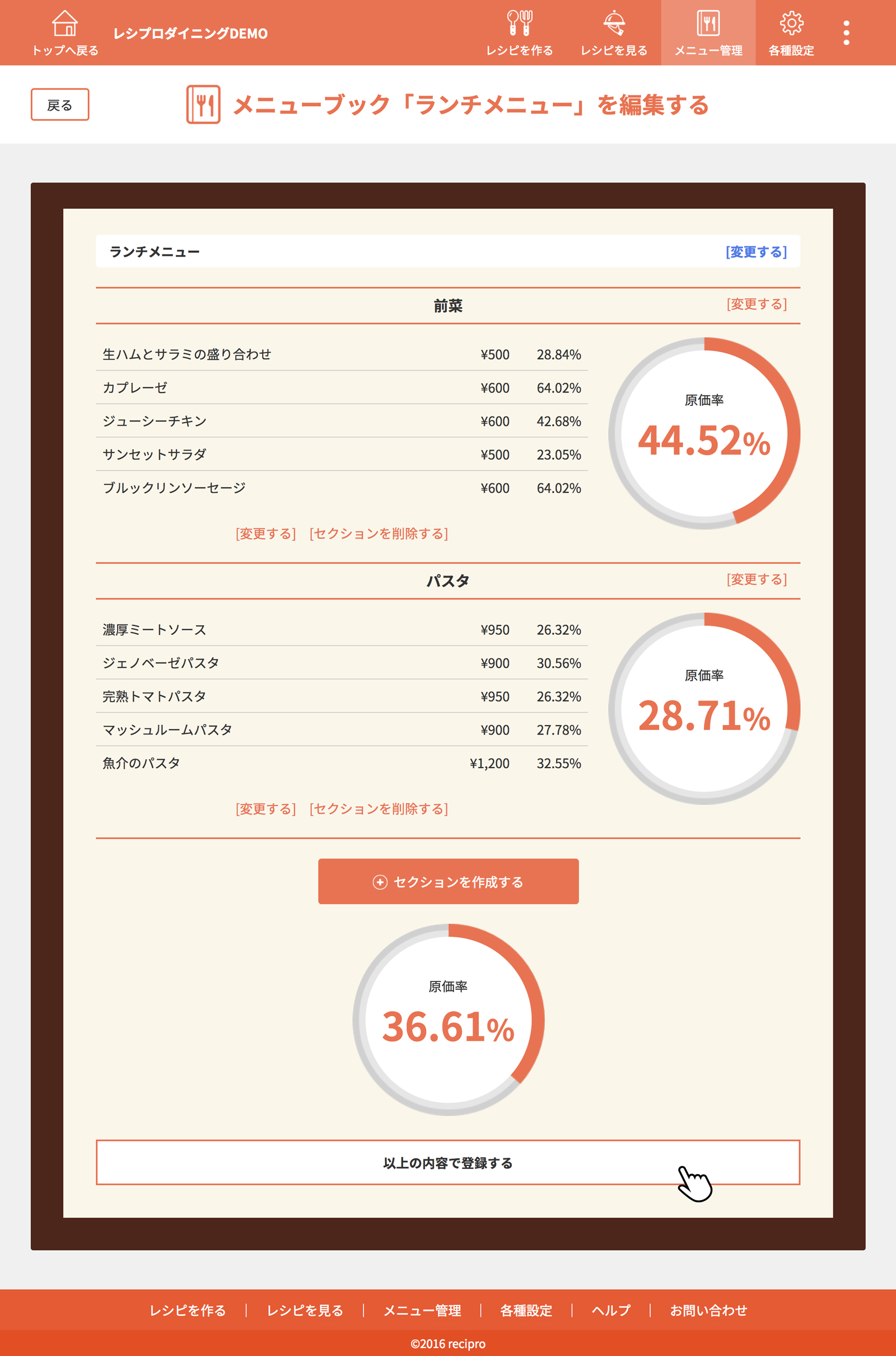 セクションごとの平均原価率、メニューブック全体の平均原価率を確認できます。