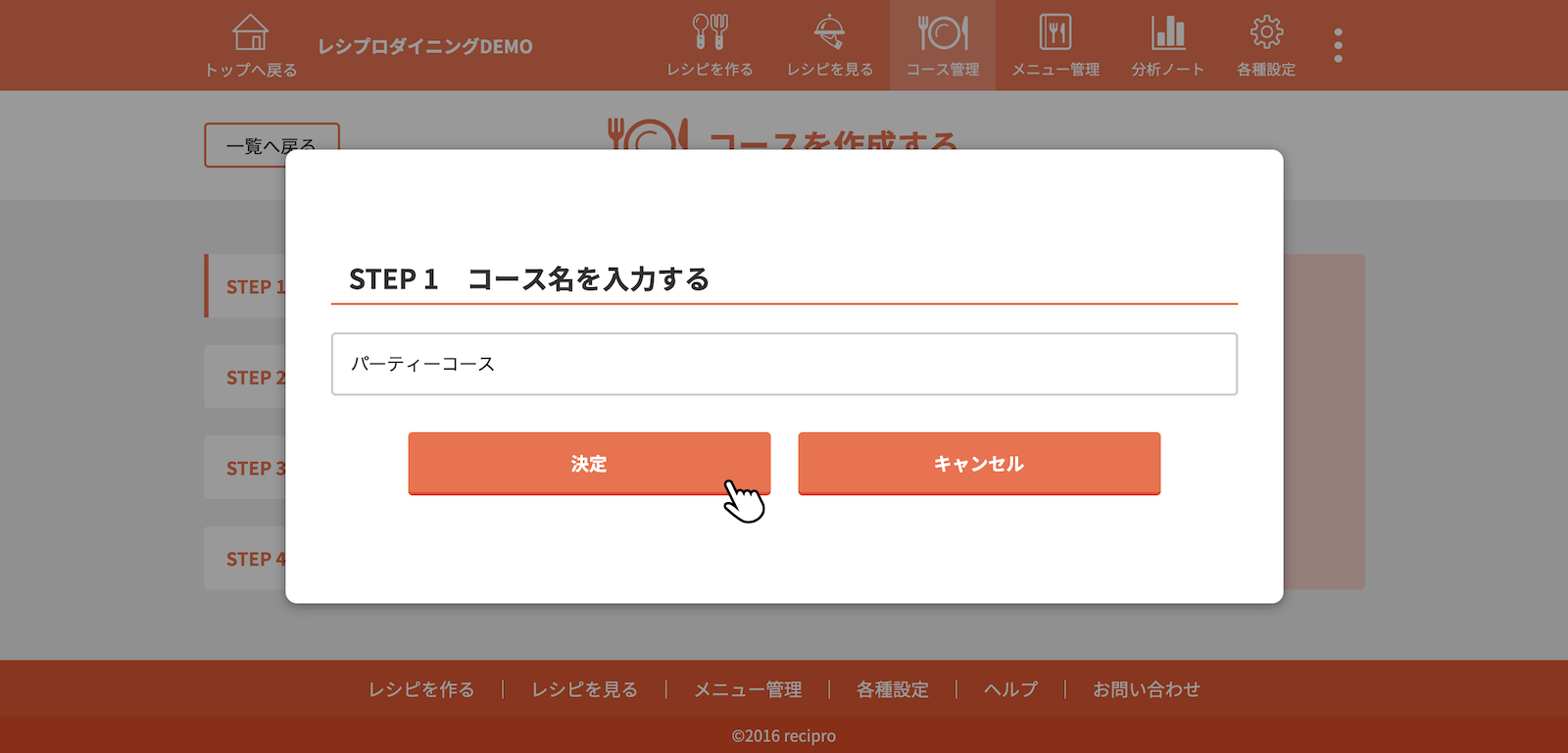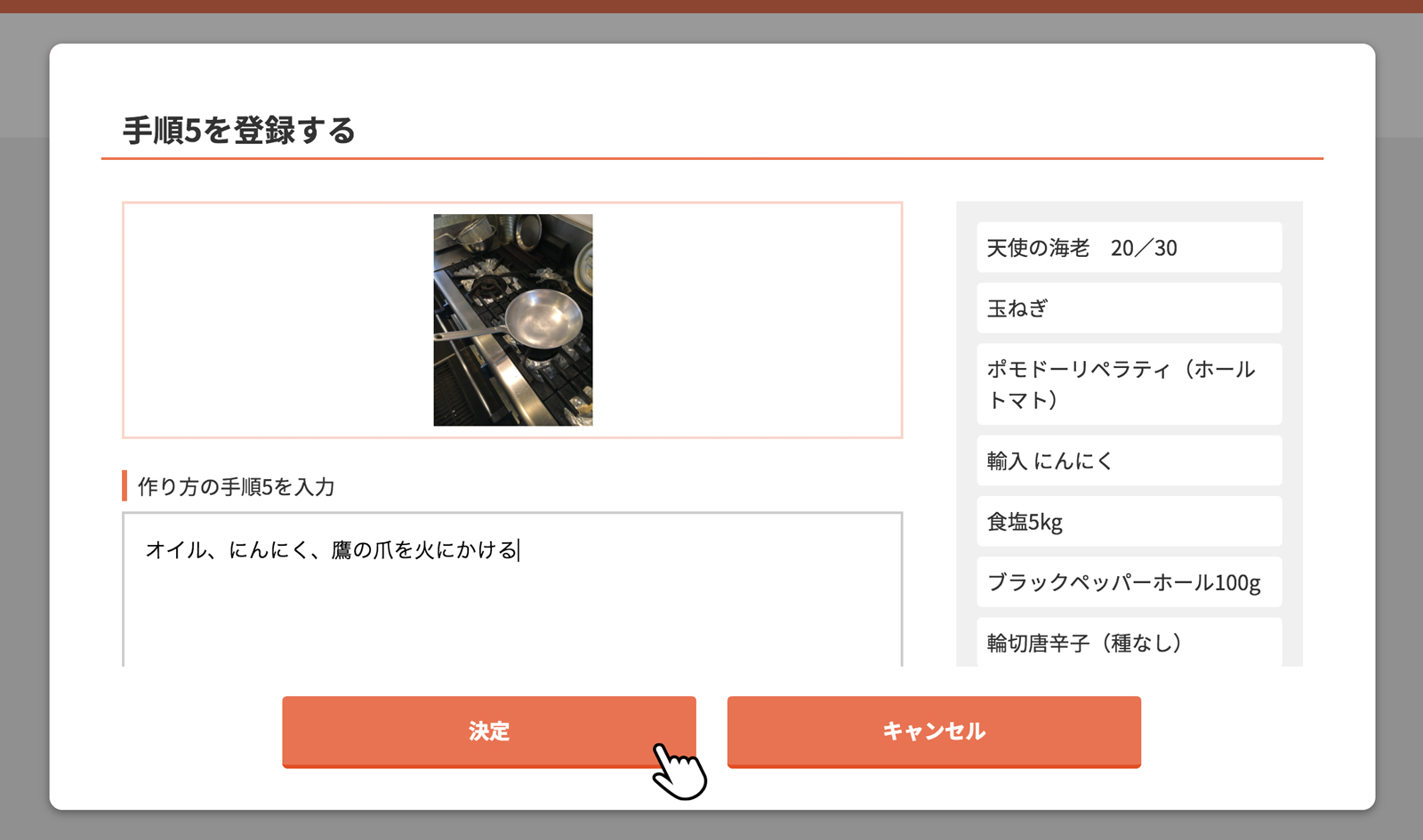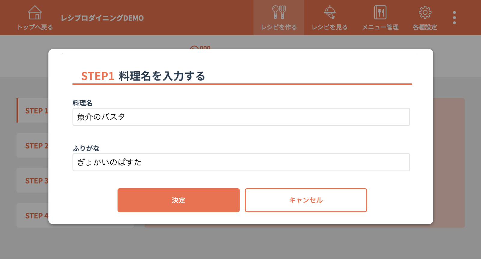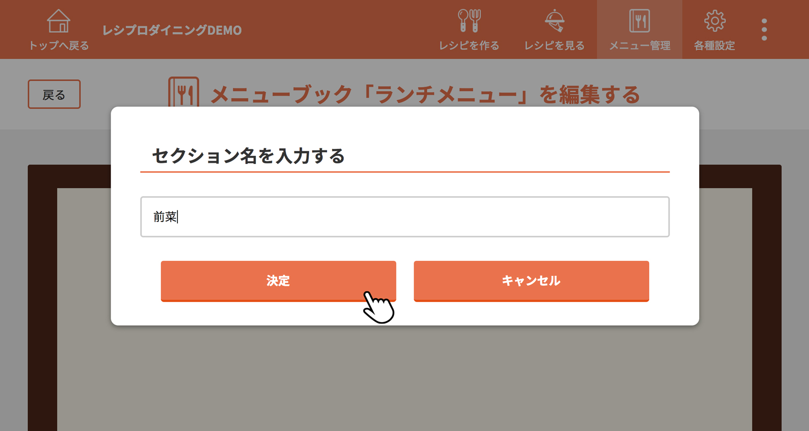 料理名を入力し、決定をクリック(タップ)
