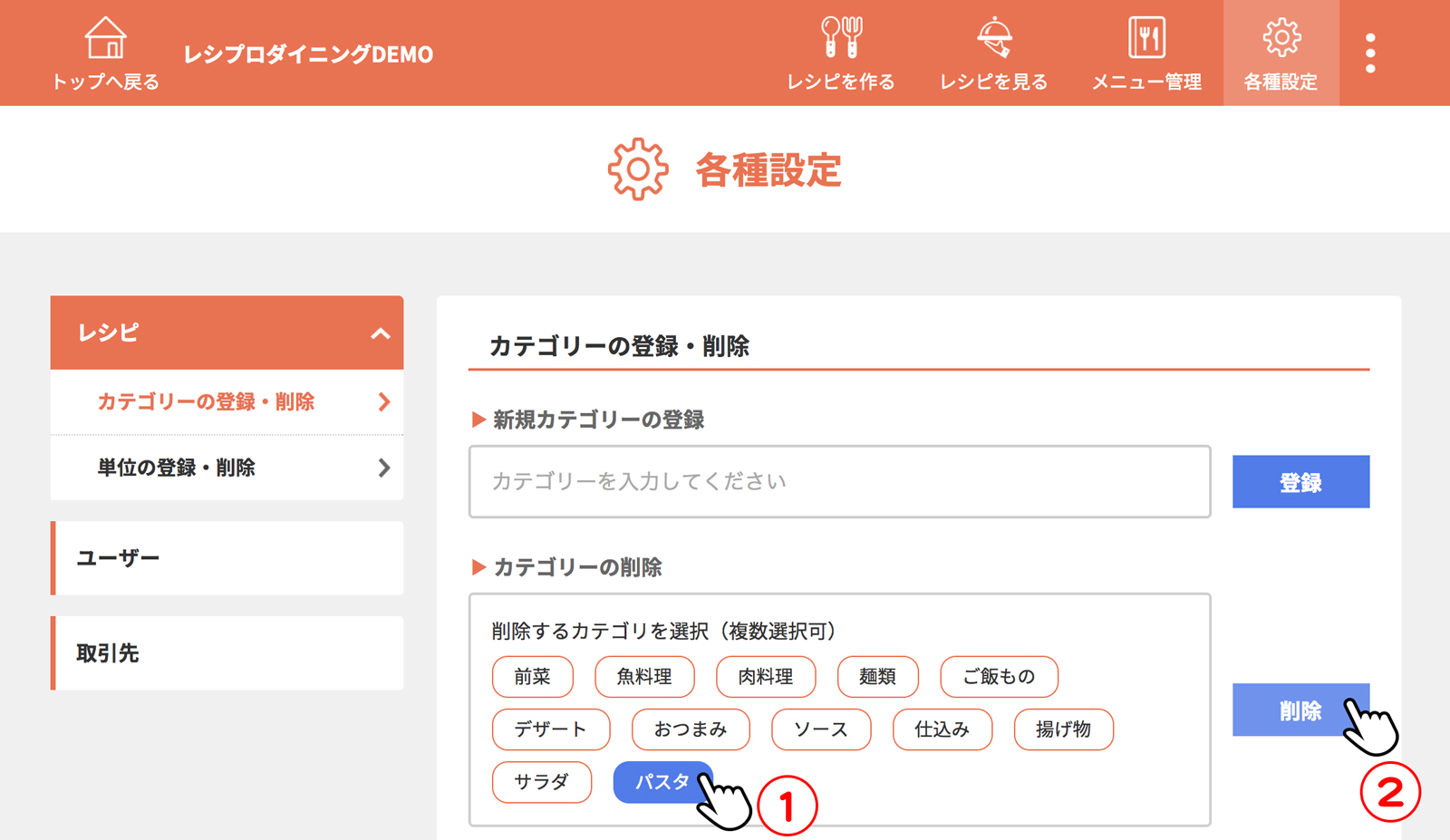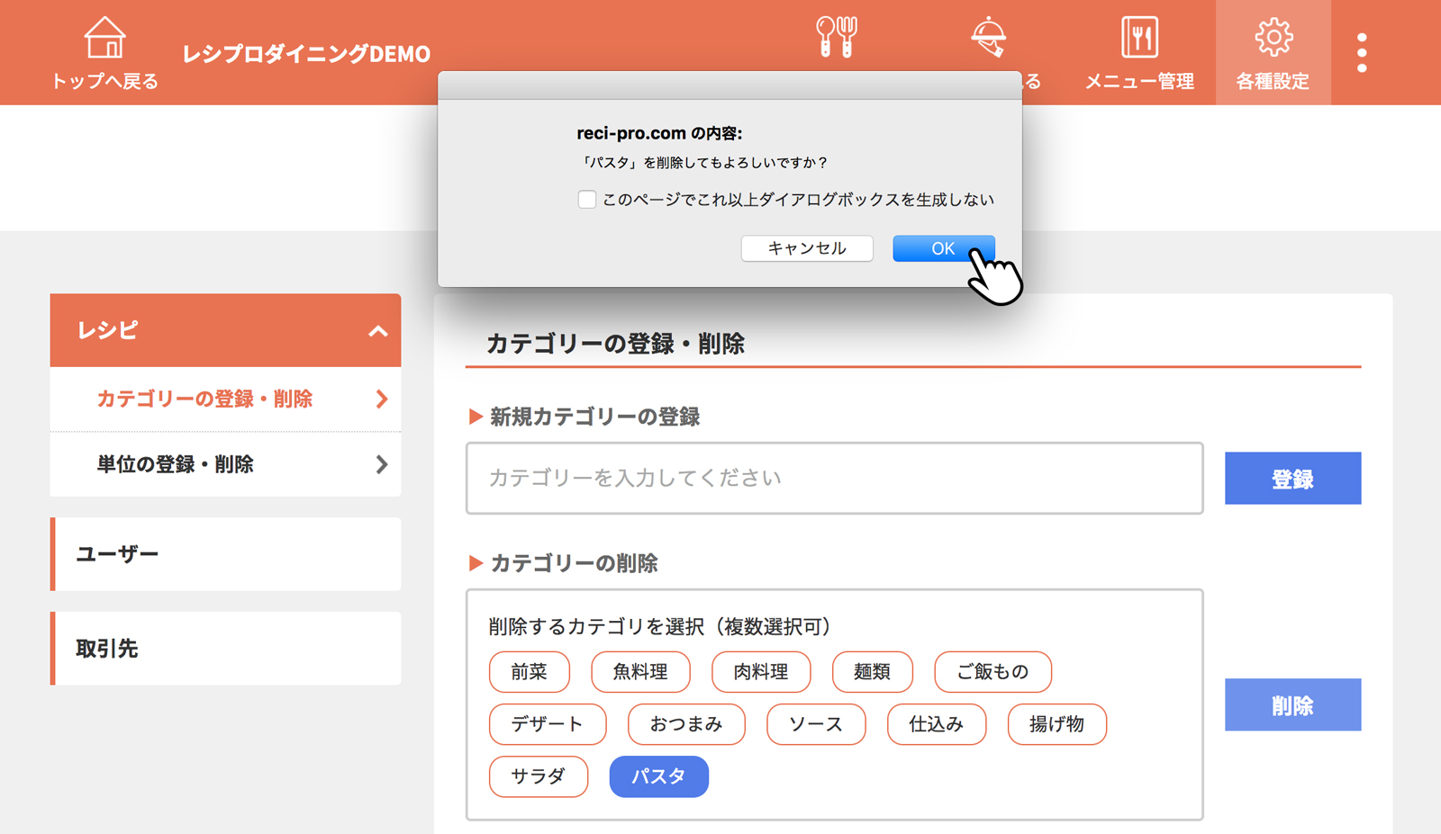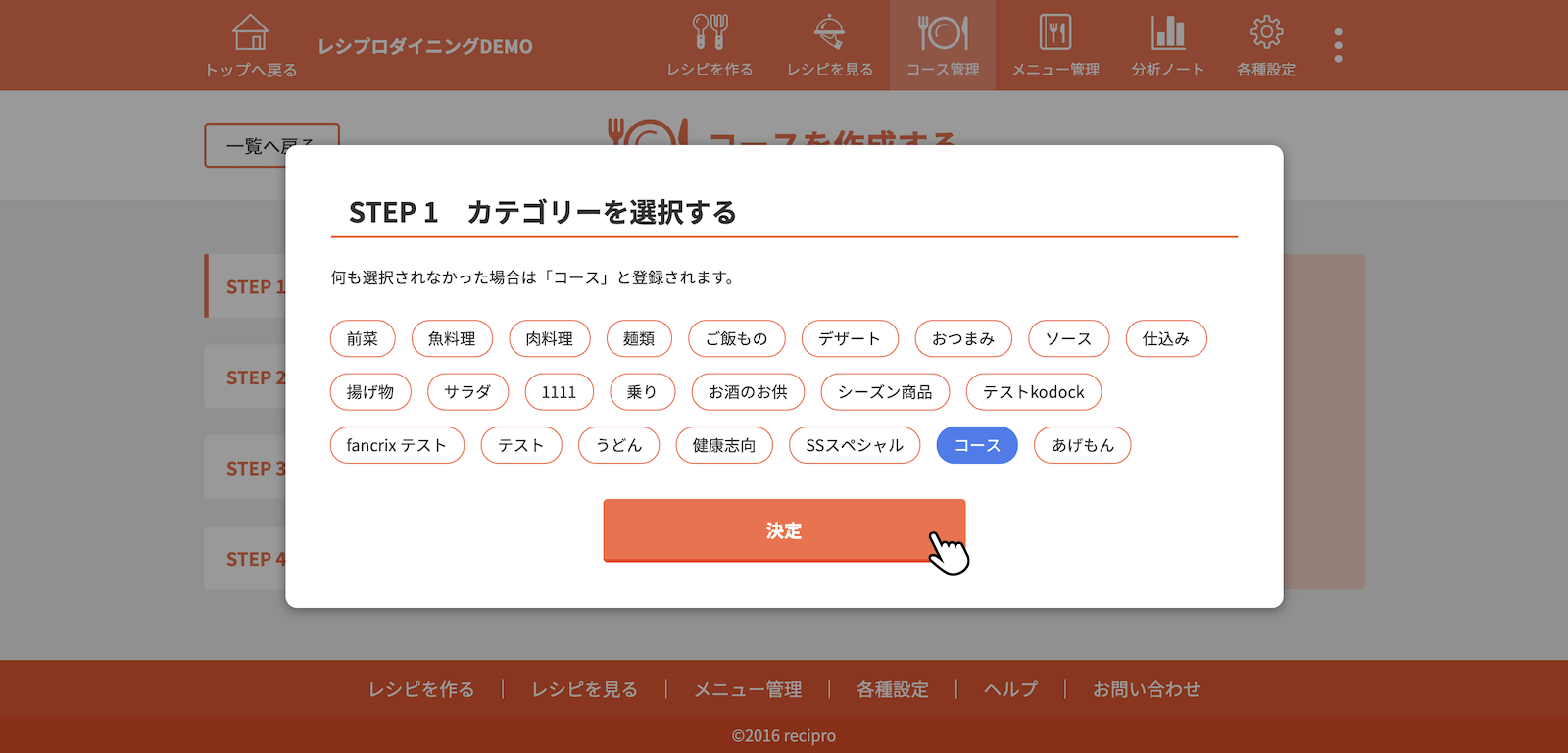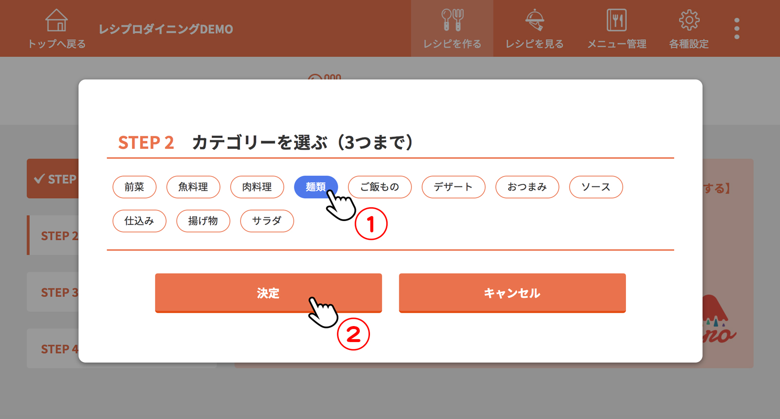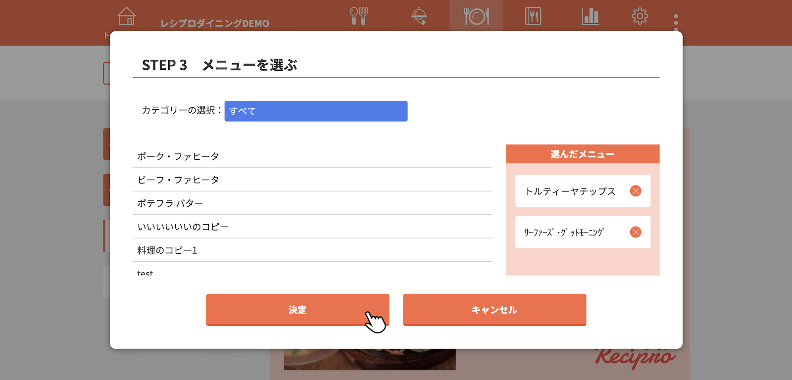 料理のカテゴリーを選択し、決定をクリック(タップ)
