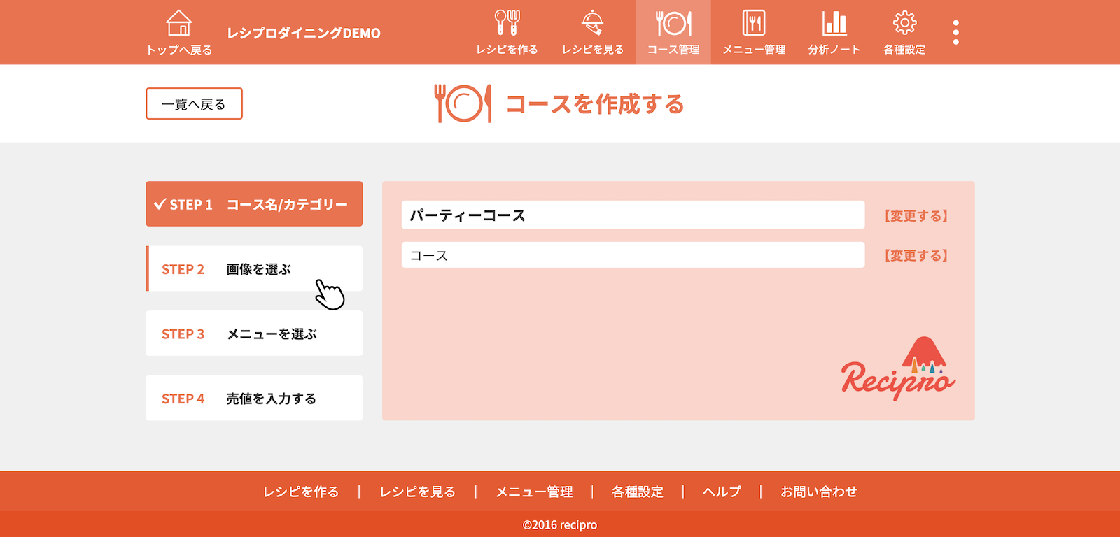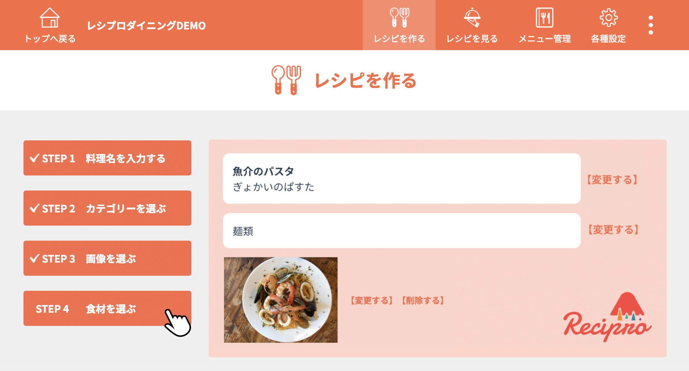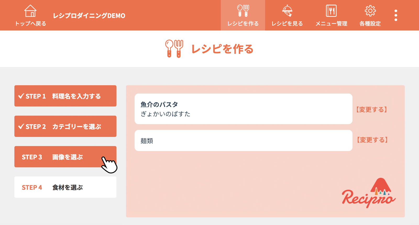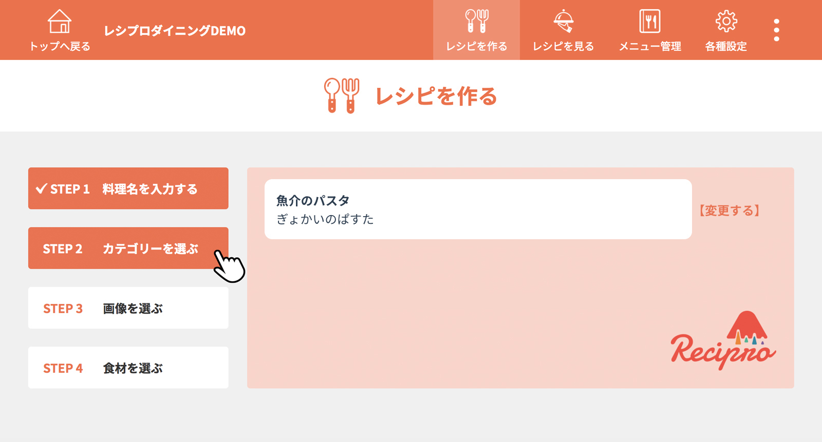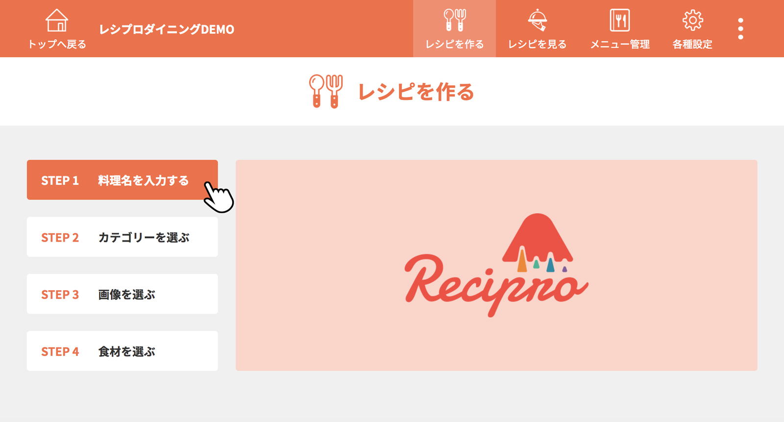 [STEP1 料理名を入力する]をクリック(タップ)