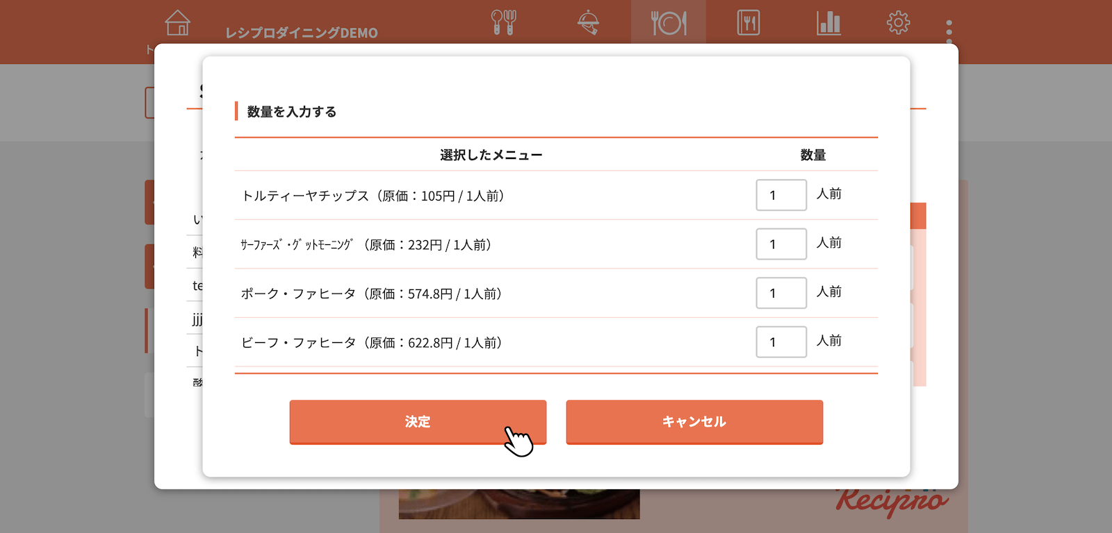 すべてのメニューの量を(人前で)入力し決定をクリック(タップ)