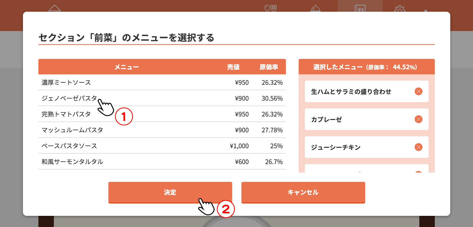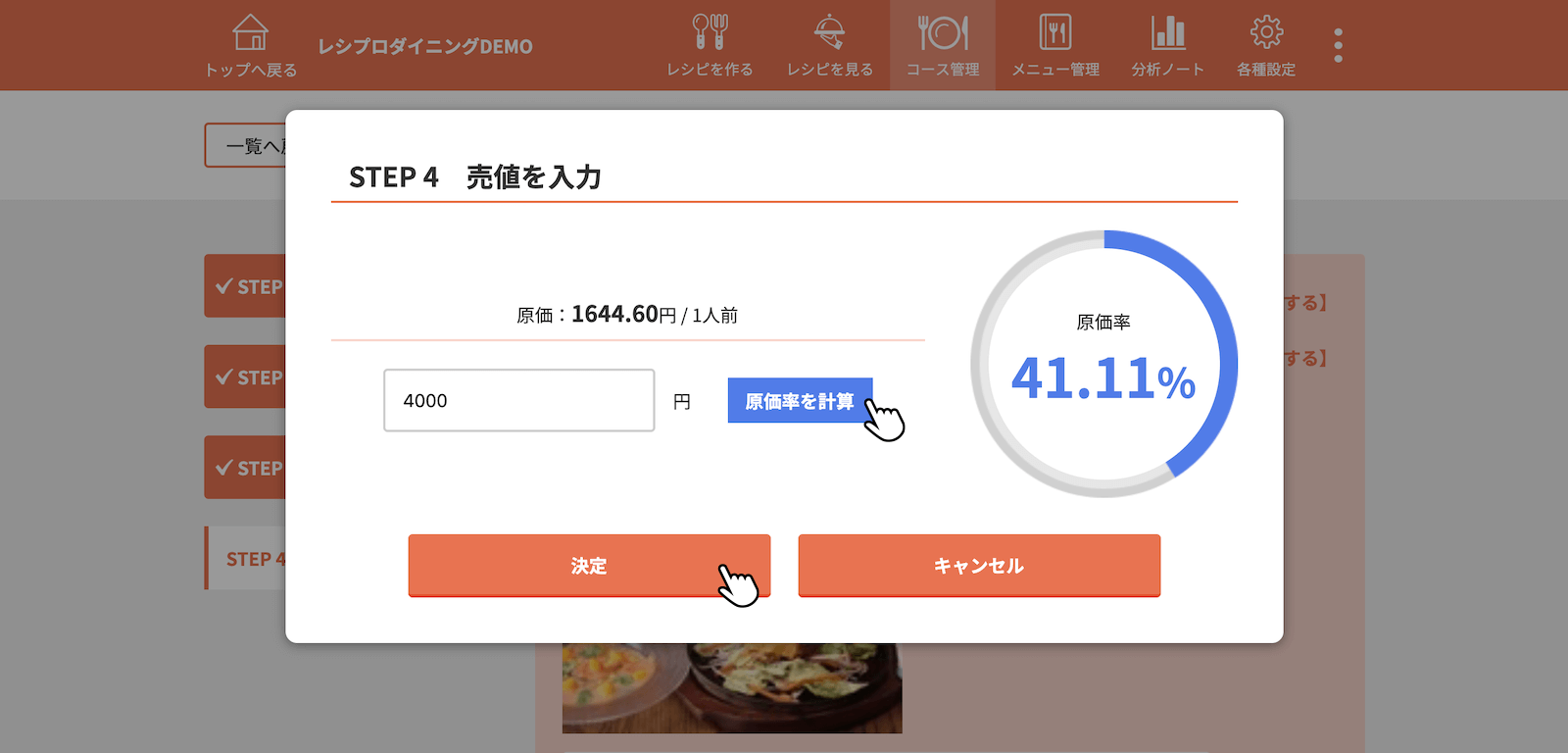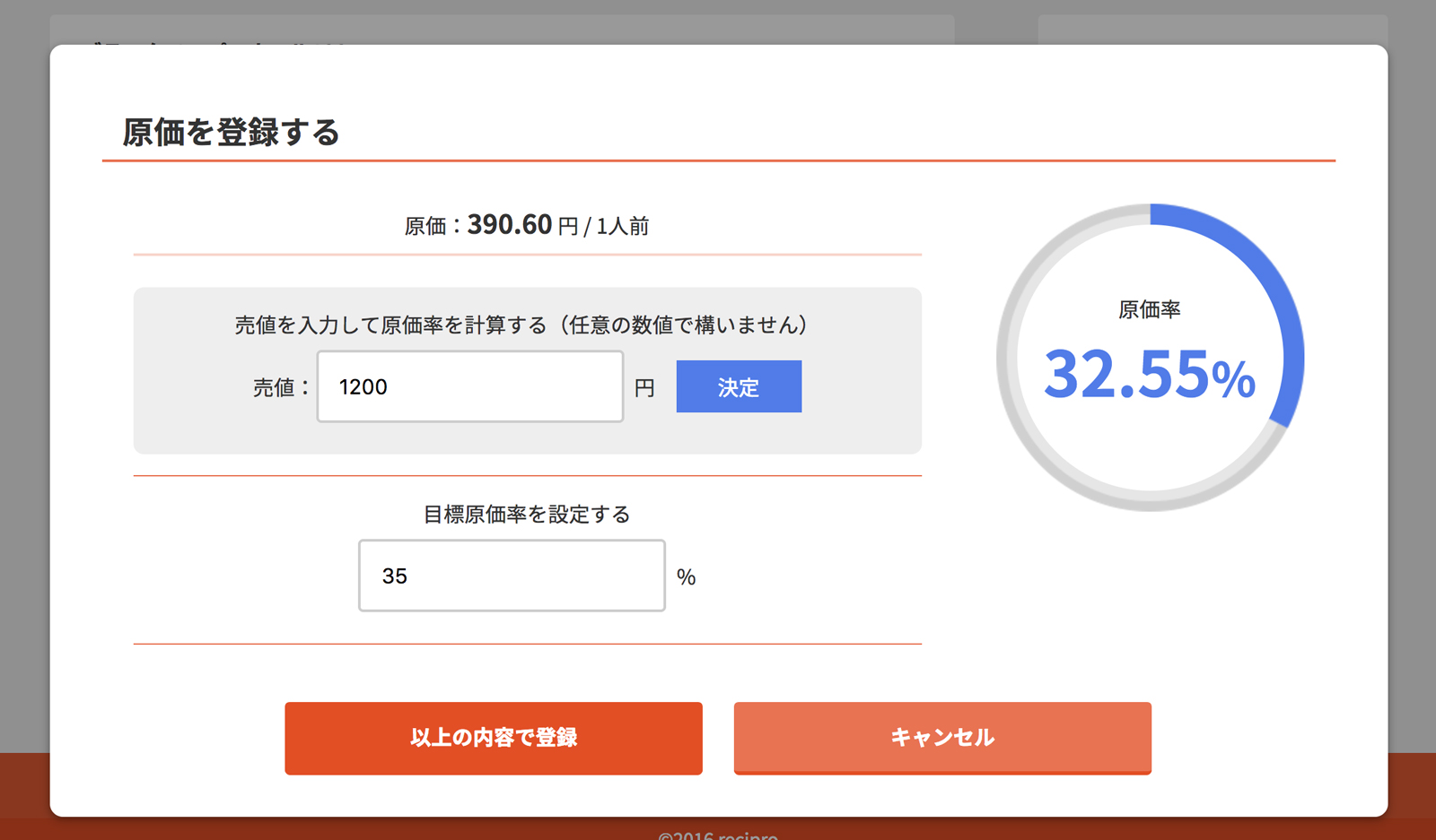 売値を入力し、[決定]をクリック(タップ)、目標原価率を入力し、[以上の内容で登録]をクリック(タップ)