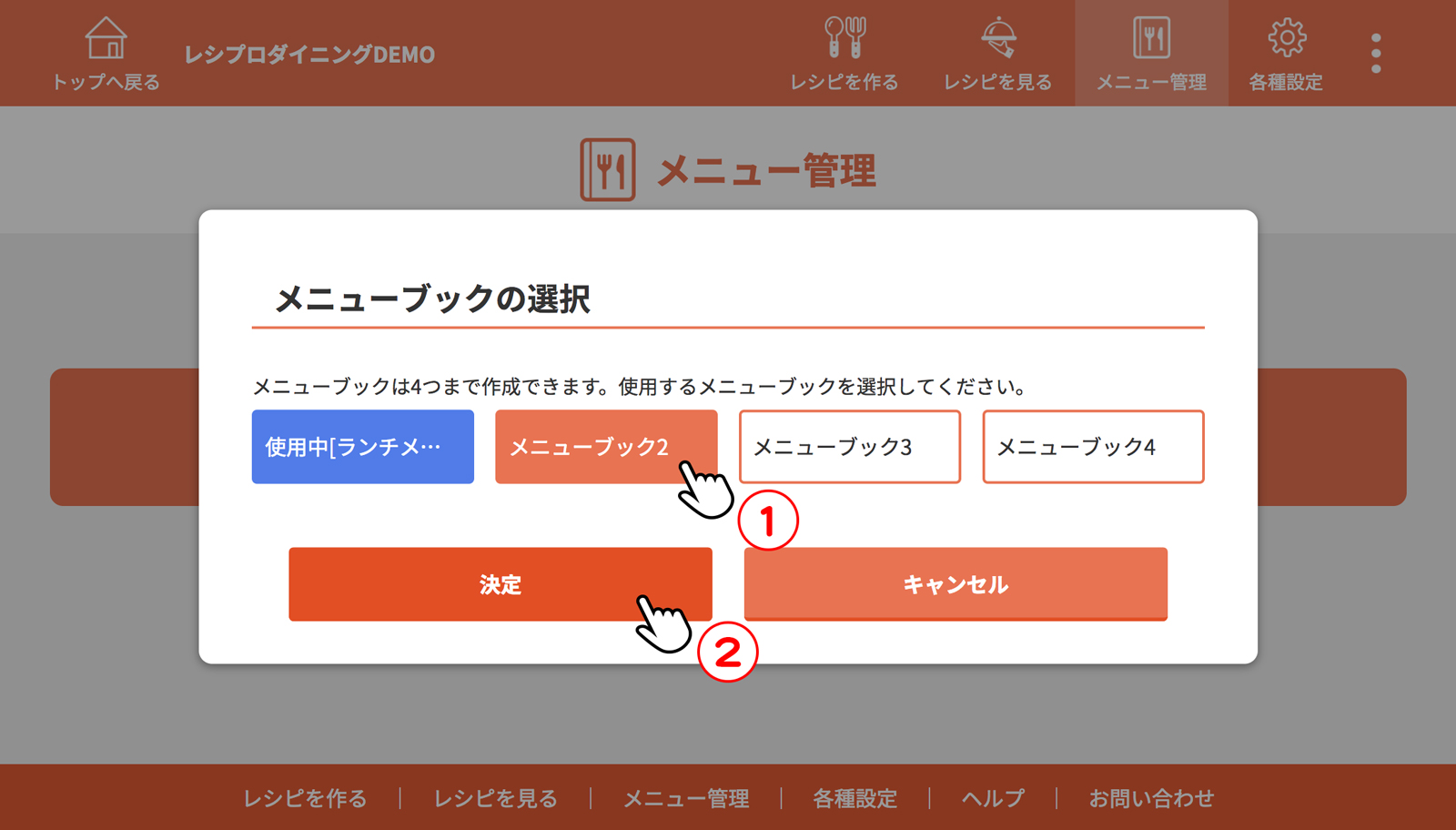使用するメニューブックを選択し、[決定]をクリック(タップ)