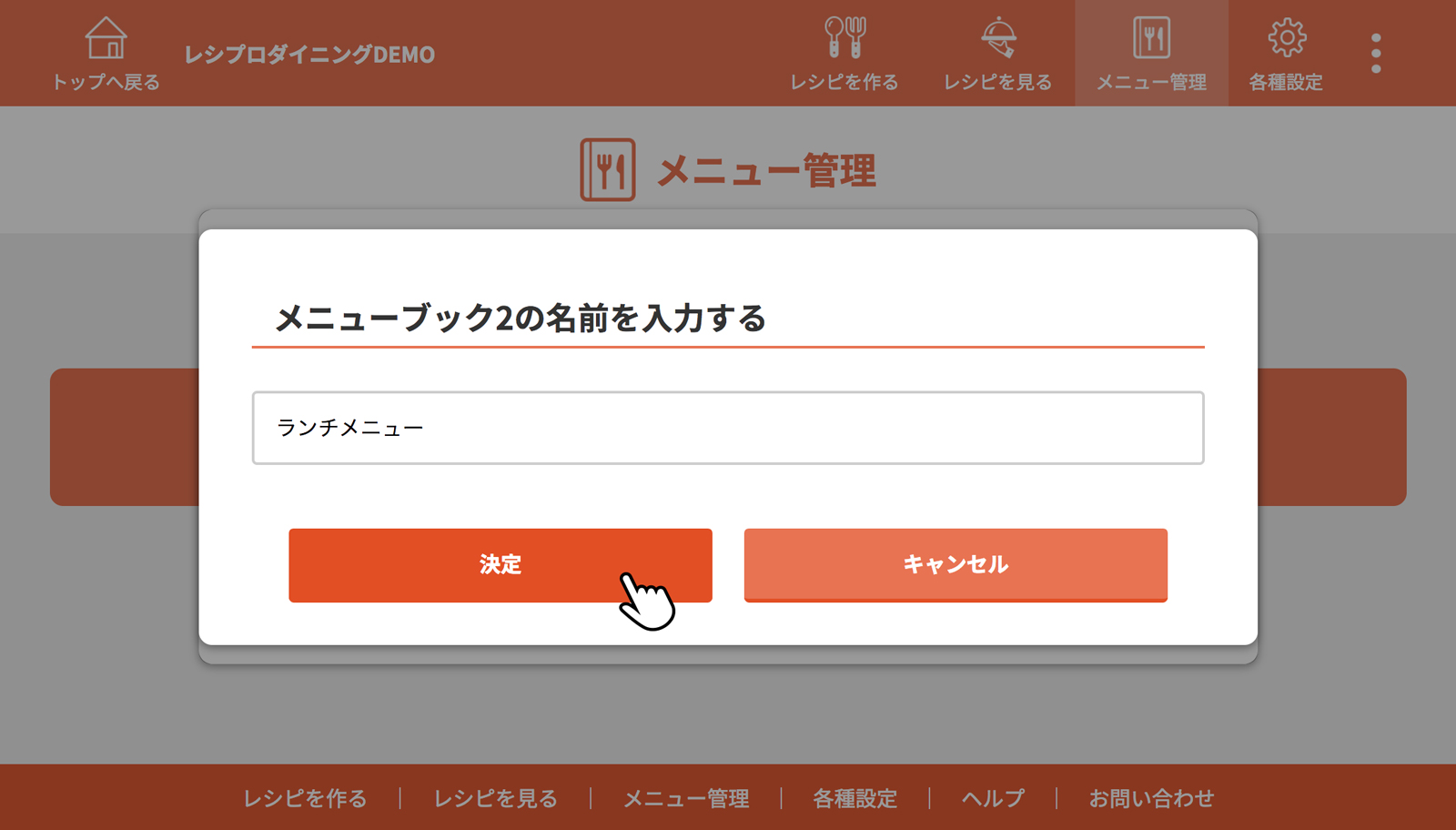 メニューブックの名前を入力し、[決定]をクリック(タップ)