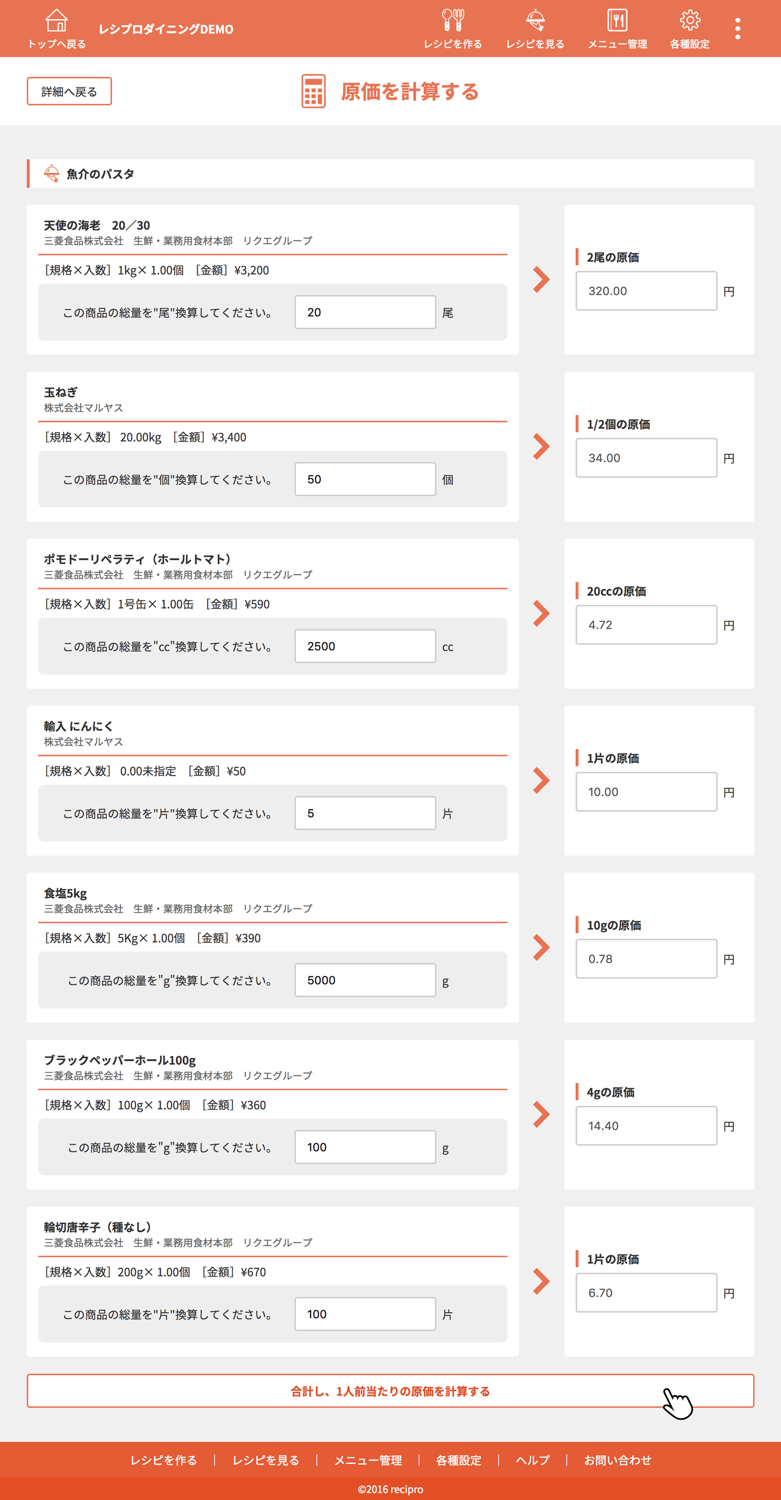 すべての食材の原価の計算後、[合計し、1人前当たりの原価を計算する]をクリック(タップ)