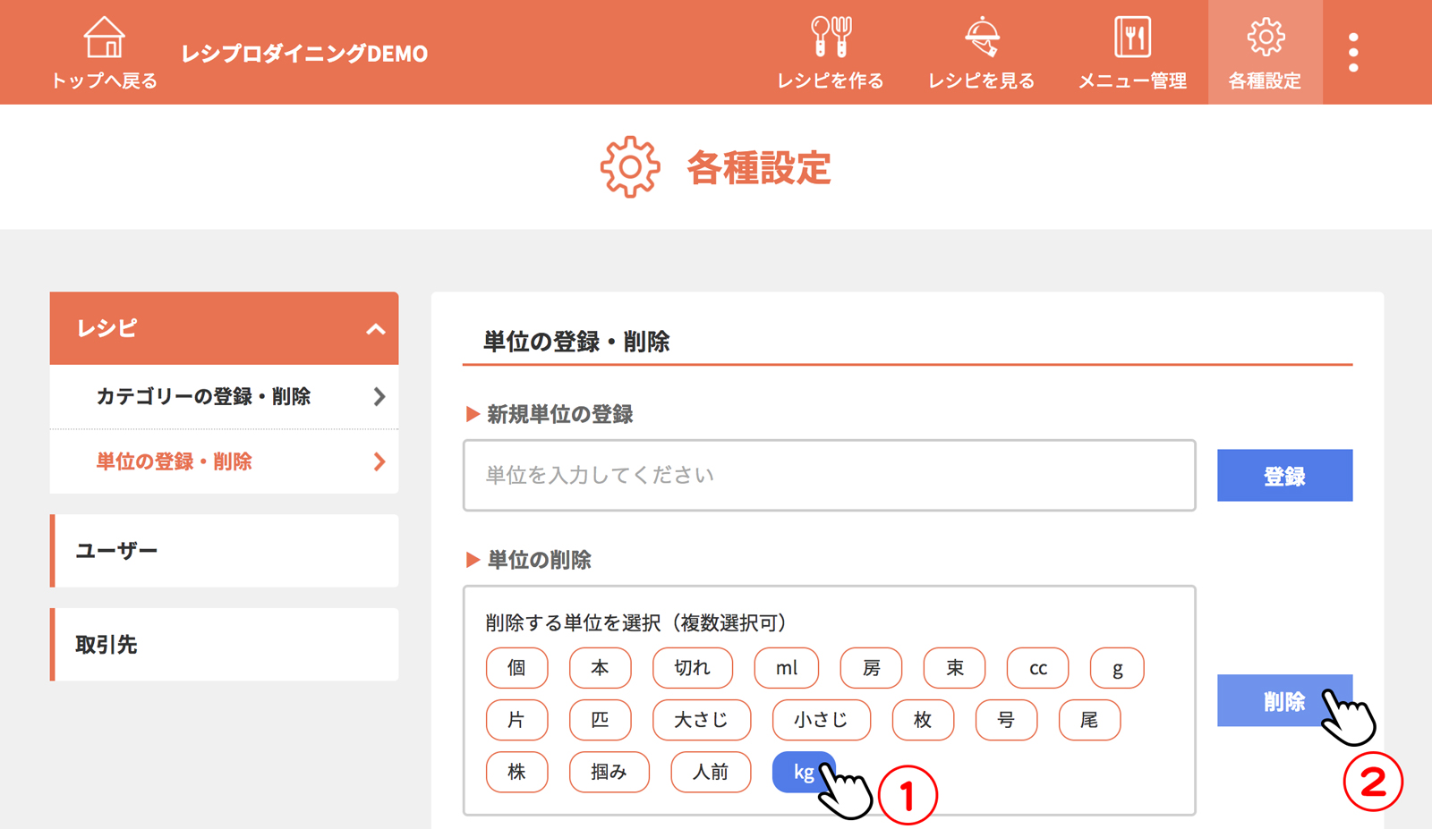 [単位の登録・削除]をクリック(タップ)