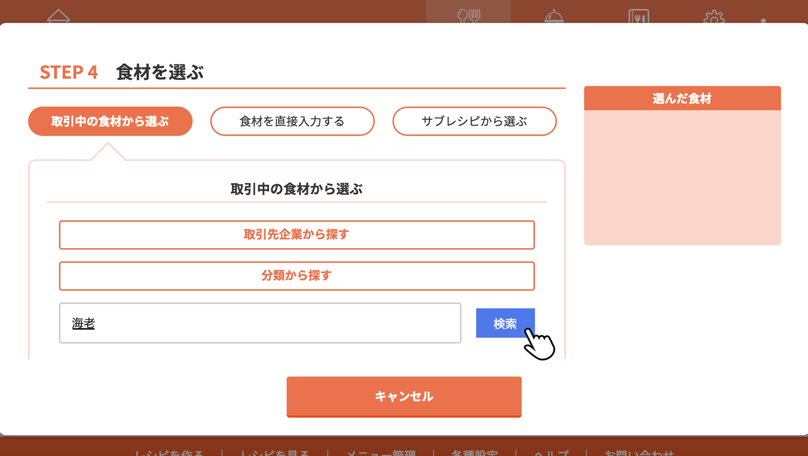 [取引中の食材から選ぶ]の場合、取引先企業からもしくは分類から食材を探し選択できます。