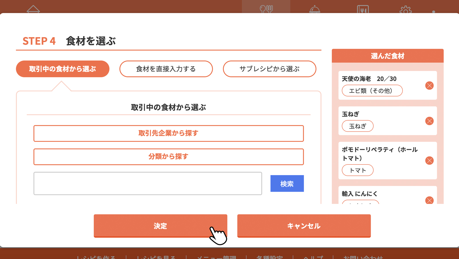 使用する食材を選び終わったら、決定をクリック(タップ)