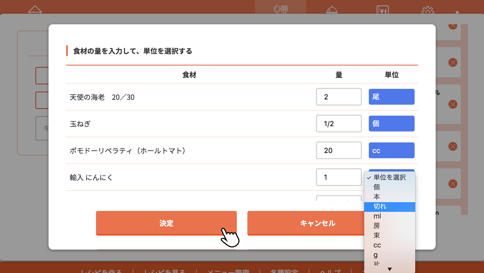 すべての食材の量を入力、単位を選択し決定をクリック(タップ)