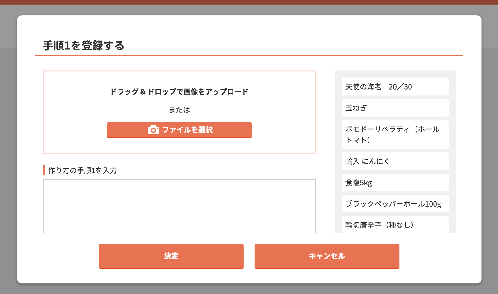 ※右側に表示されているのは、使用している食材です。手順を入力する際に参照してください。